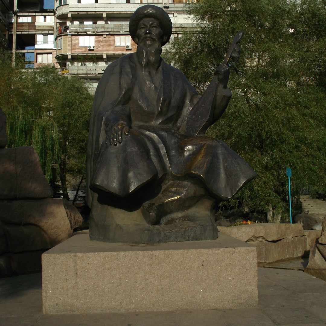 Жамбыл Жабаев — знаменитый и почитаемый в Казахстане народный поэт (акын). К 150-летию Жамбыла в 1996 году на проспекте Достык был установлен памятник. Скульптурная композиция изображает поэта, сидящего на фоне каменной стены-фонтана, символизирующего горный родник. Скульптор Б. Абишев создал реалистичный образ — задумчивый взгляд акына устремлён вдаль, правая рука лежит на колене, в левой он держит домбру.