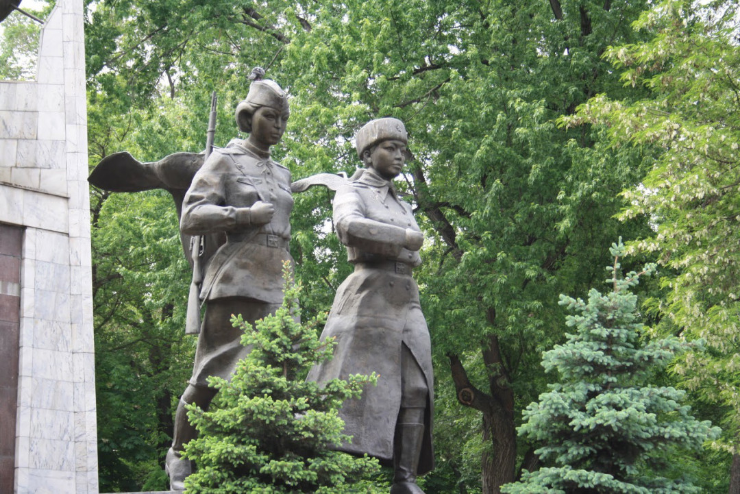 Во время Великой Отечественной войны казахстанские воины мужественно сражались в рядах Красной армии, многие были удостоены высоких наград и званий. Среди них — две девушки, Герои Советского Союза Алия Молдагулова и Маншук Маметова. В 1997 году им был установлен памятник. Его композиция условна — девушки воевали в разных местах и даже не были знакомы друг с другом. На гранитном постаменте с двумя звёздами Героев выбиты их имена на казахском языке. Две девичьи фигурки в военной форме застыли в торжественном марше. За ними — стела из белого камня с шаром, над которым из рук детей взлетают птицы.