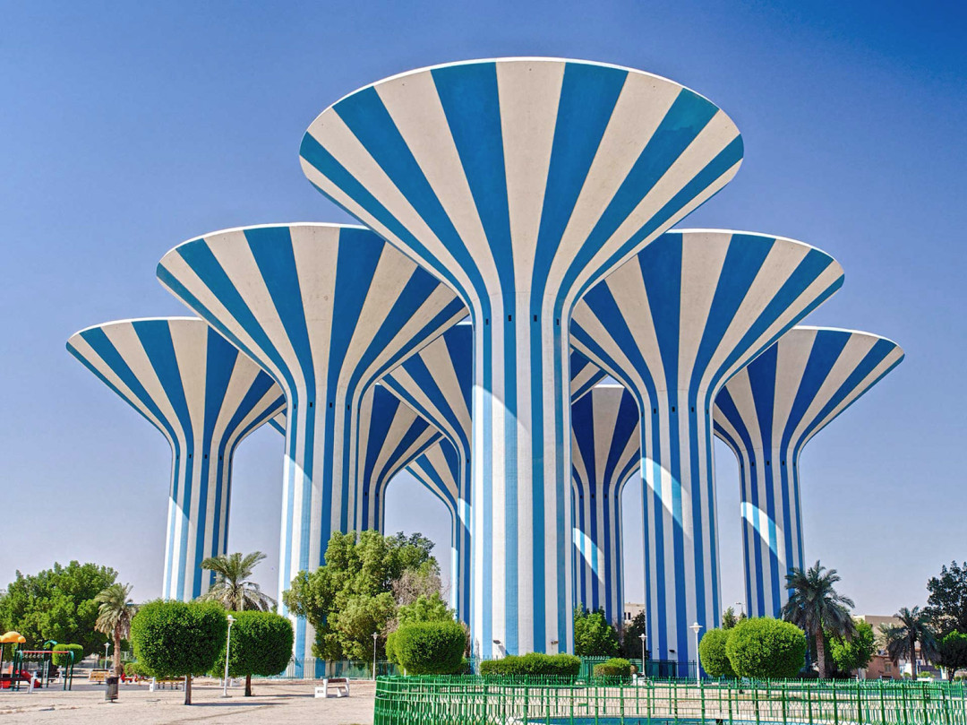 По разным районам Эль-Кувейта разбросано пять групп водонапорных башен, которые имеют узнаваемую форму грибов и яркую раскраску. Строительством кувейтских башен-грибов занималась шведская компания VBB. Автором проекта выступил датский архитектор Суне Линдстрём. Ёмкости имеют высоту от 30 до 40 м и вмещают до 3000 м³ воды. Башни отличаются друг от друга окраской и служат ориентирами в своих районах. Кроме утилитарной, сооружения несут ещё и эстетическую функцию — они стали важной архитектурной составляющей современного Эль-Кувейта, своеобразным символом почтения к воде, жизненно важному ресурсу для города, стоящего в пустыне.