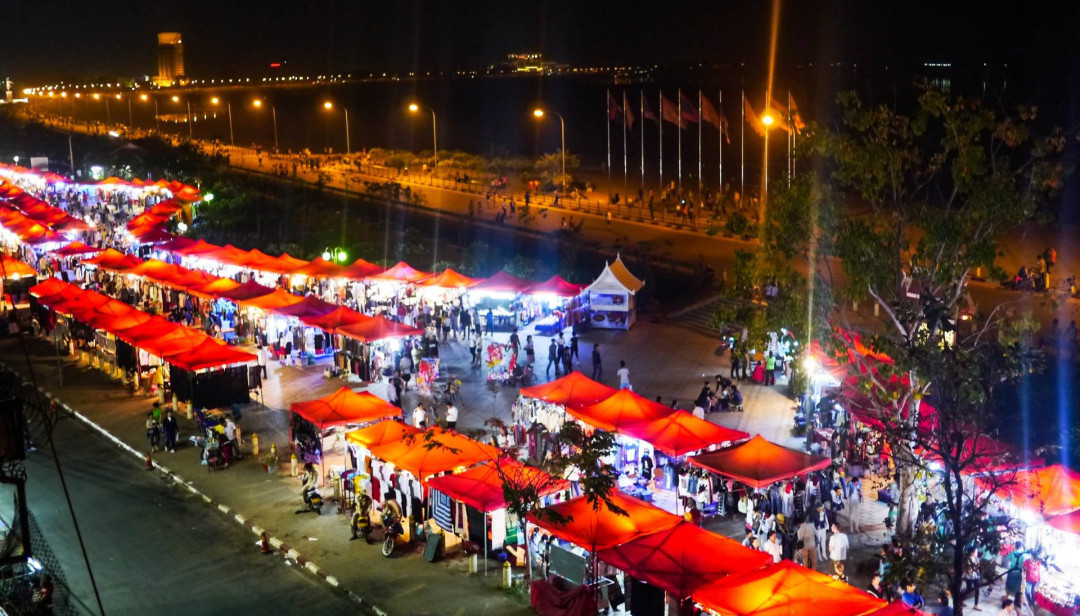 Ночной рынок в центре лаосской столицы, протянувшийся на 3 км вдоль берега Меконга, оживает с наступлением сумерек. Продавцы расставляют красные полотняные навесы с прилавками, выкладывают товар и начинается бойкая торговля. Здесь продаются украшения, сувениры ручной и фабричной работы, сумки, часы, текстиль, одежда, обувь, фрукты и местные деликатесы. Встречаются палатки с картинами местных художников. Там, где рынок примыкает к парку, обустроена детская площадка и стоят фургоны с фастфудом и выпечкой. Выстроившиеся вдоль дороги макашницы предлагают запечённые на огне морепродукты, мясо, рыбу, сосиски. Здесь же продают фруктовые фреши, тростниковый сок. Через дорогу, напротив кафе под открытым небом стоят солидные павильоны, где продаётся такой же товар, что в палатках, но уже дороже. Торг на рынке не просто уместен — обязателен. Продавцы предпочитают принимать оплату лаосской валютой — кипами, имеет хождение тайский бат и доллар. Снять наличные можно в многочисленных банкоматах, расположенных тут же, на территории рынка.