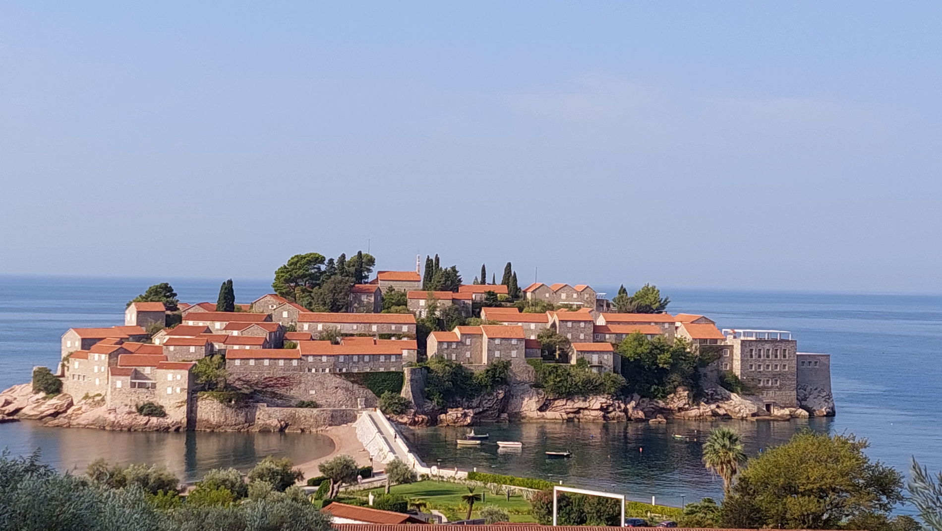 Описание: Визитная карточка Черногории. Бывшая рыбацкая деревня XV века на острове, превращенная в элитный отель-городок. Мы осматриваем его сверху — это самый фотогеничный ракурс на красные черепичные крыши, соединенные с берегом узким перешейком.