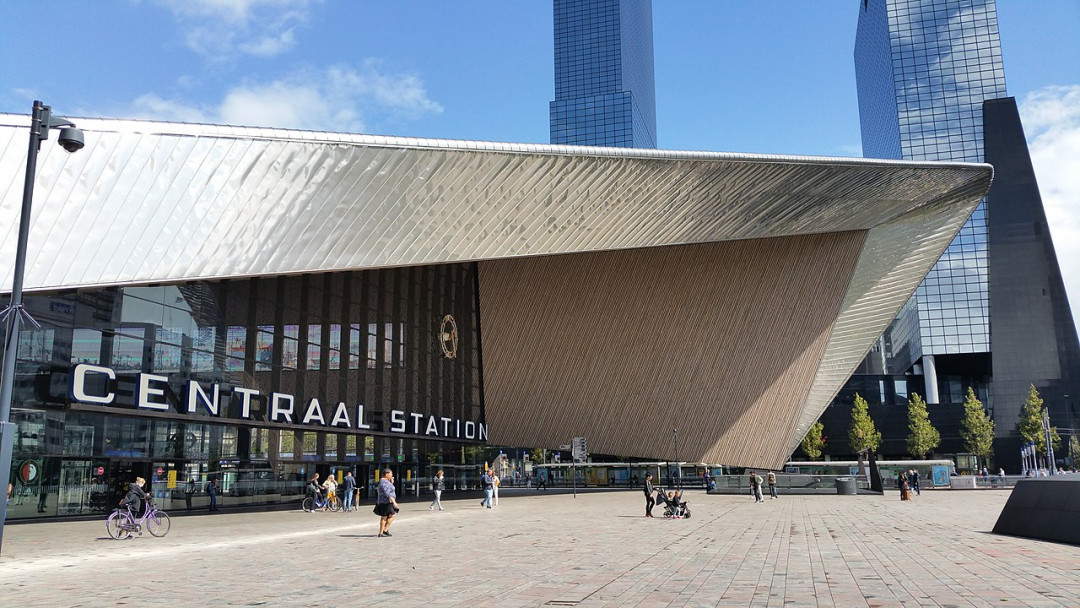 Центральный вокзал Роттердама — яркий образец современной архитектуры. Построенное из бетона, металла и стекла здание оформлено оригинальным массивным козырьком, который напоминает наконечник стрелы. Внутри фигурный потолок отделан деревом. Благодаря прозрачным стенам просторные залы залиты светом.