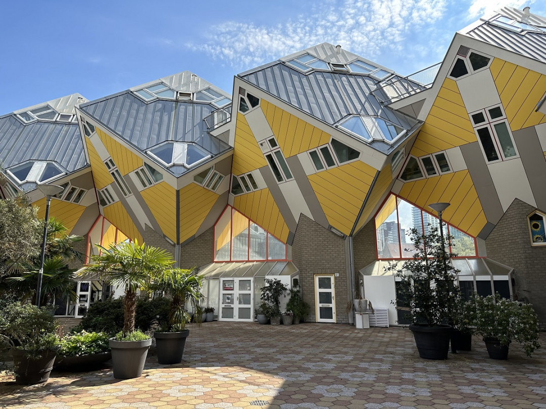 Кубические дома — знаменитое творение голландского архитектора Пита Блома. В 70-х годах прошлого столетия власти Роттердама начали масштабную застройку города и обратились к Блому с просьбой создать проект жилого квартала. В 1984 году в городе появились необычные дома, которые представляли собой перевернутый куб, углом упирающийся в шестигранный пилон.
