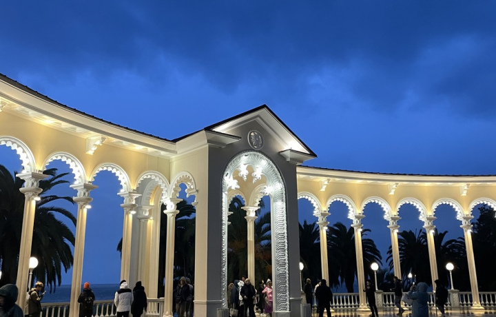 Гагрская колоннада, возведённая в честь победы в Великой Отечественной войне. Рядом находится Приморский парк, в который мы с вами тоже заглянем.