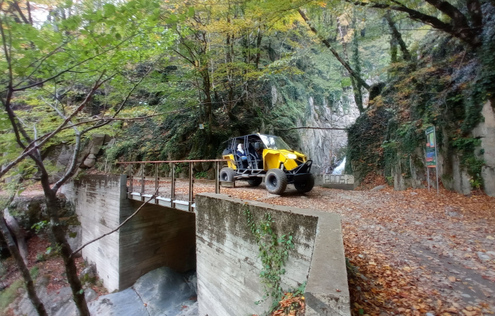 Набираем ключевую воду из самого известного родника, находящегося неподалёку, потом сворачиваем на старую краснополянскую дорогу и мчим до смотровой площадки в посёлке Монастырь, где находится визитная карточка Красной Поляны — вид на ущелье Ахцу. Фотографируемся, проверяем технику перед бездорожьем и при необходимости переодеваемся.