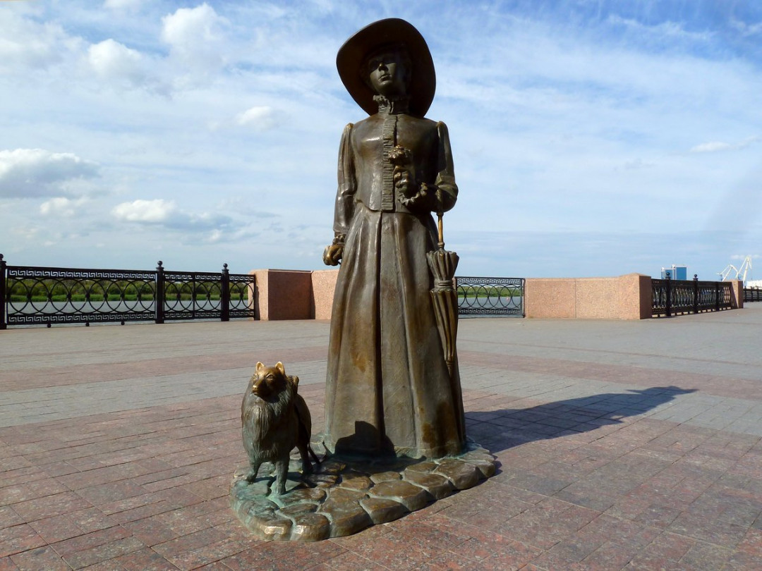На пересечении Никольской улицы и волжской набережной стоит бронзовая фигура Дамы с собачкой. Женщина, одетая по моде XIX века, держит в руке небольшой букетик цветов. У её ног сидит маленькая собачка. Эта композиция не связана со знаменитым произведением А. П. Чехова. До революции таких «дам» можно было встретить в каждом крупном городе России. Только задумчивый взгляд и печальное выражение лица создают некоторое сходство с чеховской героиней.