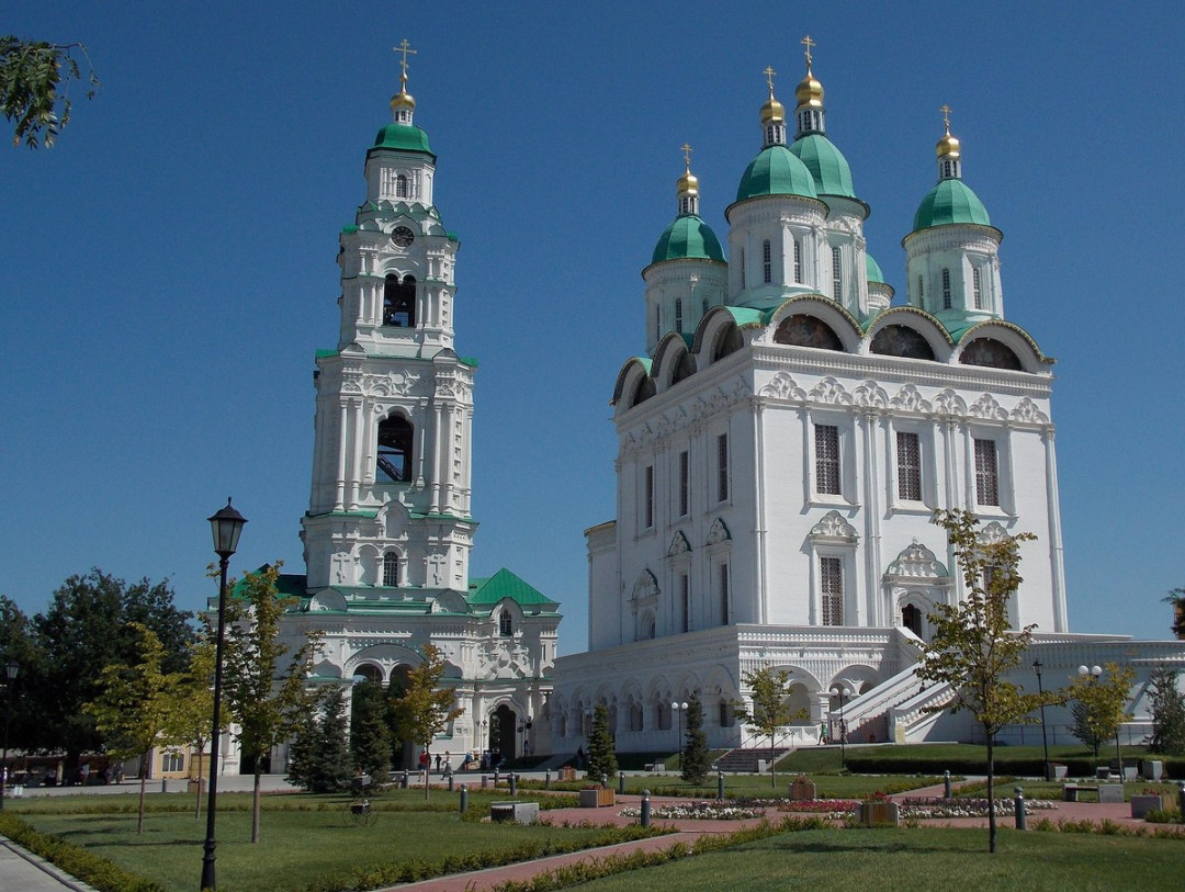 На территории Астраханского кремля возвышается крупнейший храм города — собор Успения Пресвятой Богородицы. Первое деревянное здание было построено при Иване Грозном в 1568 году, когда царь даровал городу Владимирскую икону Божьей Матери. К началу XVII века собор сильно обветшал. Пристроенный к нему в 1602 году каменный храм тоже простоял недолго. Современный собор, сохранивший до наших дней первоначальный облик, построили в 1710 году. В его архитектуре сочетается московское барокко и неоклассицизм. Величественный фасад богато декорирован лепниной. Здание венчают пять золотых главок с крестами, установленных на тонких барабанах.