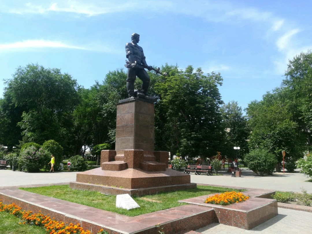 К 450-летию Астрахани правительство Республики Казахстан сделало городу щедрый подарок — памятник казахскому народному музыканту и поэту XIX века Курмангазы Сагырбаеву, который похоронен в селе Алтынжар Астраханской области. В дополнение была облагорожена прилегающая территория и отреставрированы исторические здания, которые служат фоном для памятника Курмангазы. Скульпторы Едиге Рахманов и Токтарбек Рахиев изобразили поэта верхом на коне. В поднятой руке он держит домбру. Памятник торжественно открыли в декабре 2008 года.