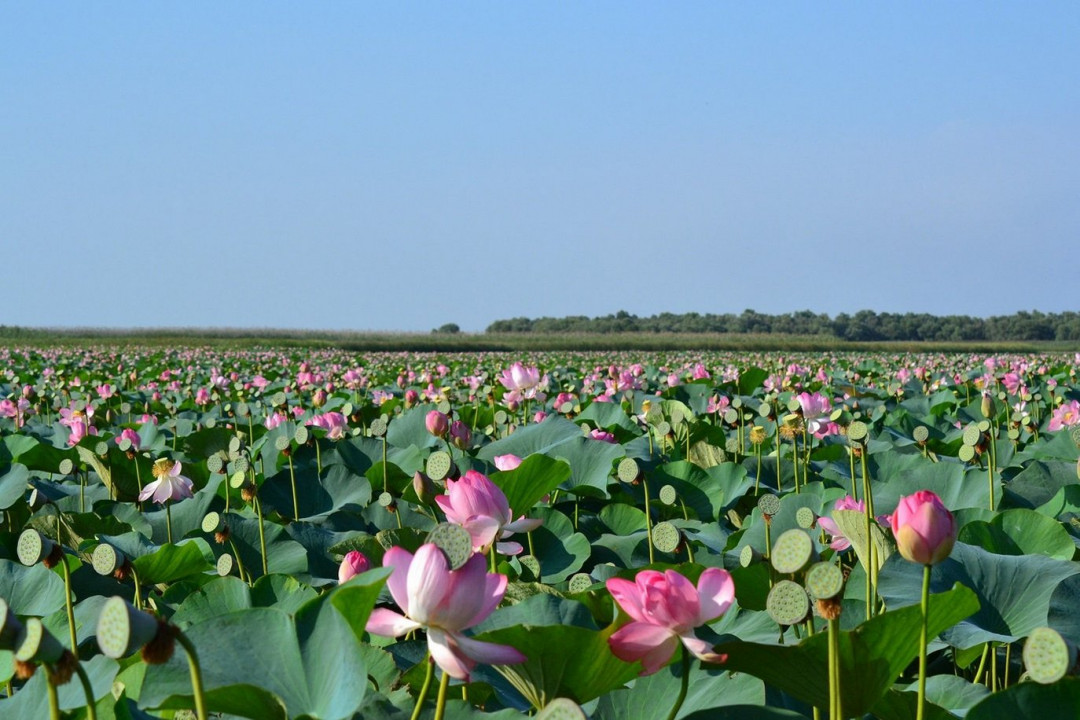Обширные лотосовые поля раскинулись недалеко от Астрахани в дельте Волги. Они считаются самыми северными плантациями экзотического цветка на планете. Впервые небольшое поле лотосов в низовьях Волги обнаружили в 1912 году. Для охраны редкого для этих мест растения был создан биосферный заповедник. За столетие площадь полей выросла с 0,4 до 5000 гектаров. С июля по сентябрь цветение полей не прекращается — одни цветки увядают, на их месте распускаются новые бутоны. Листья некоторых экземпляров могут достигать в диаметре 1 метра, а цветки — 60 см. Самые большие и красивые поля находятся у взморья в устье Волги. Для туристов организуют частные экскурсии на лодках и групповые туры на теплоходах, которые отходят от астраханской набережной.