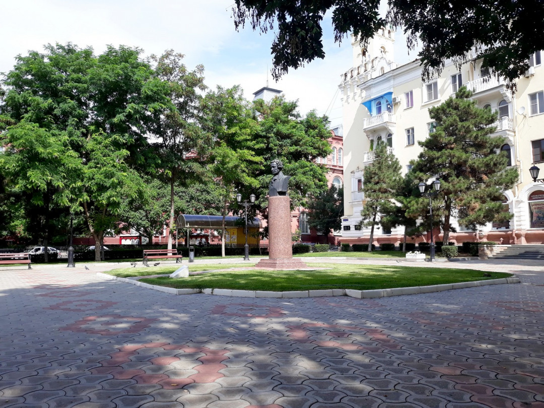 Маленький аккуратный сквер Пушкина разбит вокруг памятника поэту. Бронзовый бюст на круглом гранитном постаменте работы белорусского скульптора З. И. Азгура установили на пересечении улиц Советской и Коммунистической в 1958 году. Он стоит на фоне здания советской эпохи, которое сегодня признано памятником архитектуры. В сквере часто собираются местные писатели и поэты, по инициативе астраханских властей проводятся литературные чтения.