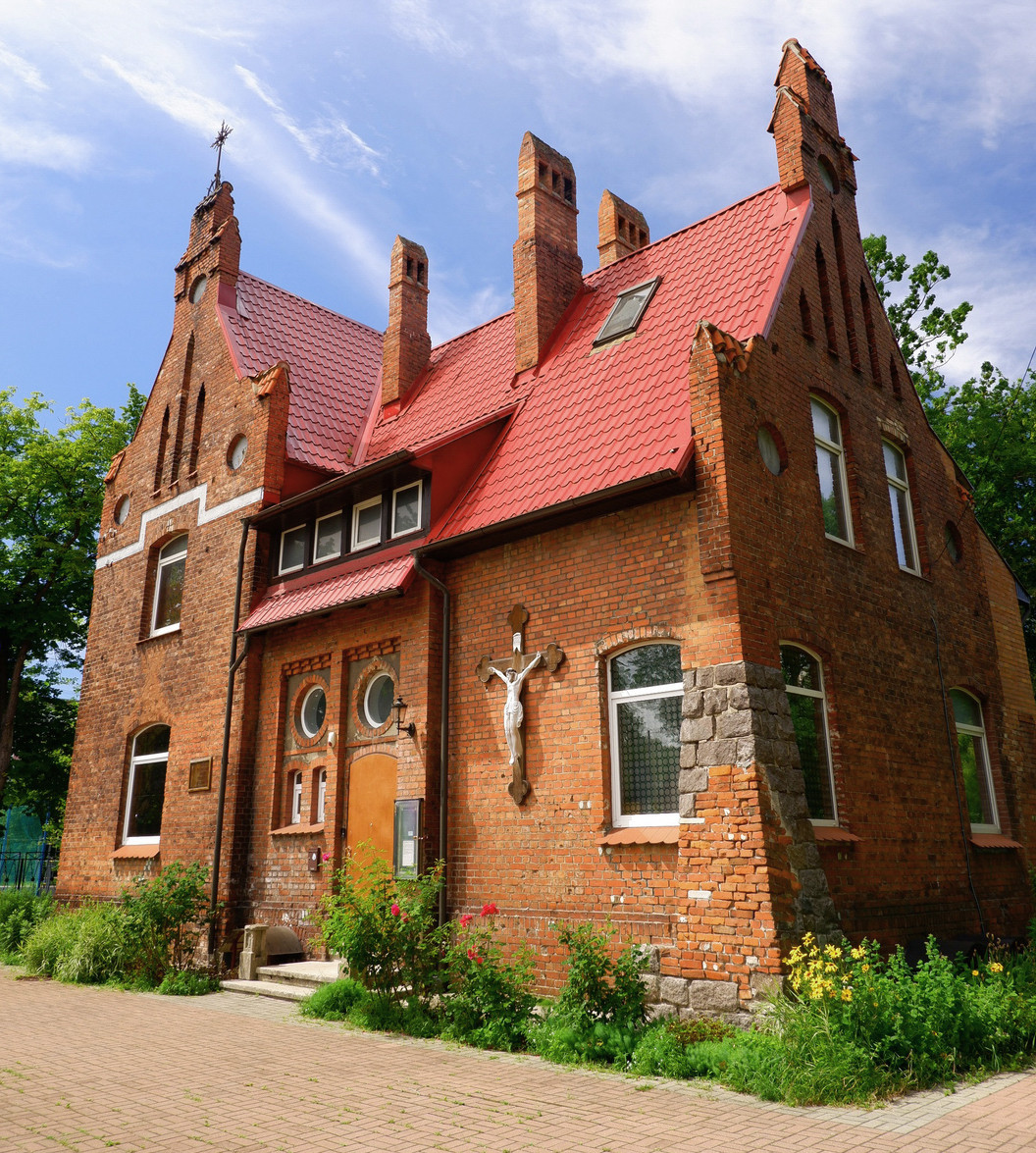 Дом пастора был построен вместе кирхой «Мария Морская звезда» в 1910 году. Во время штурма Пиллау храм был разрушен, а пасторский домик уцелел. Кирпичное здание — образец неоготической архитектуры, его украшают ступенчатые фронтоны, декоративные детали, рядом с входом на стене висит распятие. Сейчас первый этаж Дома пастора занимает римско-католический приход, на втором живёт настоятель.