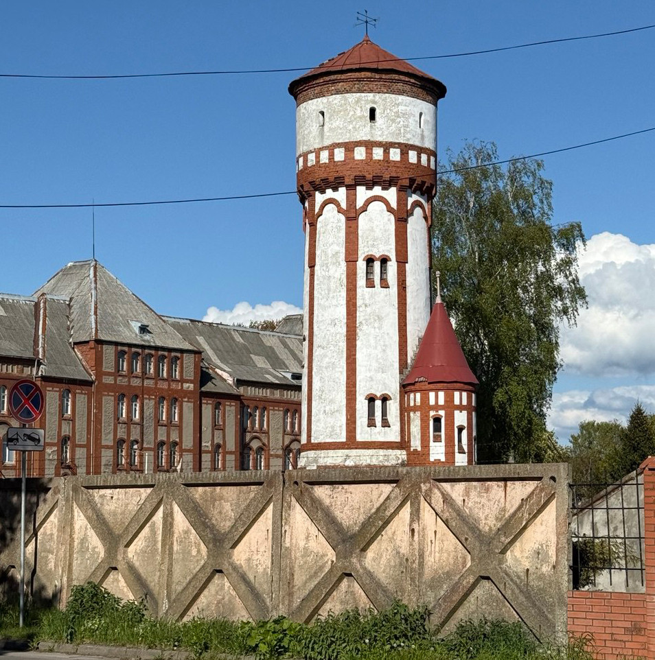 Самая красивая из водонапорных башен Балтийска та, что входит в архитектурный ансамбль Пехотных казарм. Её построили в 1905 году для снабжения водой центра Пиллау. Высота сооружения — 30 м. На белых стенах контрастным красным цветом выделен декор — лопатки, фигурный фриз, изогнутые линии орнамента. Вход оформлен в виде маленькой круглой башенки с остроконечной крышей. Водонапорную башню венчает плоский шатёр с флюгером на шпиле.