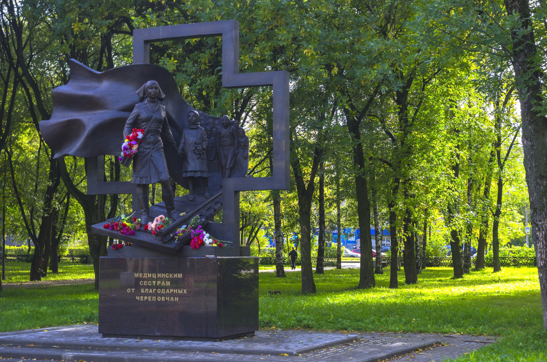 «Медицинская сестра — ангел-хранитель, который ведёт людей из мира войны к миру милосердия», — так автор проекта, скульптор А. Рожников определил концепцию памятника медсёстрам. Монумент появился в Череповце в 2015 году — к 70-летию Победы. В годы Великой Отечественной войны весь город был гигантским госпиталем, через который прошли 2,5 миллиона раненых бойцов и жителей блокадного Ленинграда. С Череповецкого вокзала отправился знаменитый эшелон № 312 — «Поезд милосердия», на котором городские врачи и медсёстры уехали на фронт.