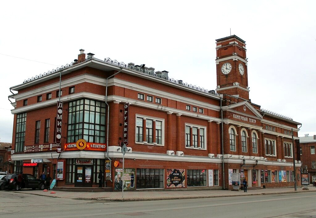 Здание Камерного театра — одно из самых красивых в Череповце. В нарядном фасаде сочетаются кирпичный стиль и неоклассика, гармонично дополненные башней с часами над парадным входом. Здание строилось в 1914–1917 годах под Торговые ряды на средства местного купечества. Первый этаж занимали магазины, на втором планировалось разместить Народный театр со зрительным залом, фойе и буфетом. Профессиональной труппы в Череповце в то время не было, зато существовал коллектив из «господ-любителей».