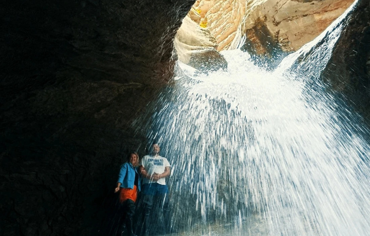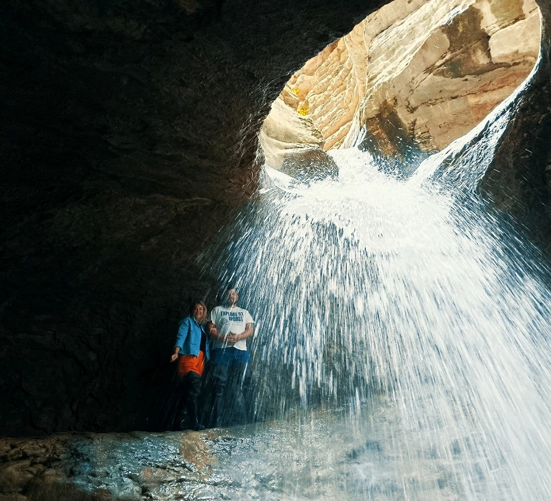 10:30–11:30 — Салтинская теснина. Вы пройдёте по узкому каменному ущелью, где вода струится прямо по дну каньона. В конце пути вам откроется подземный водопад внутри скал. Это единственный водопад такого типа в Дагестане и одна из самых впечатляющих природных локаций региона.