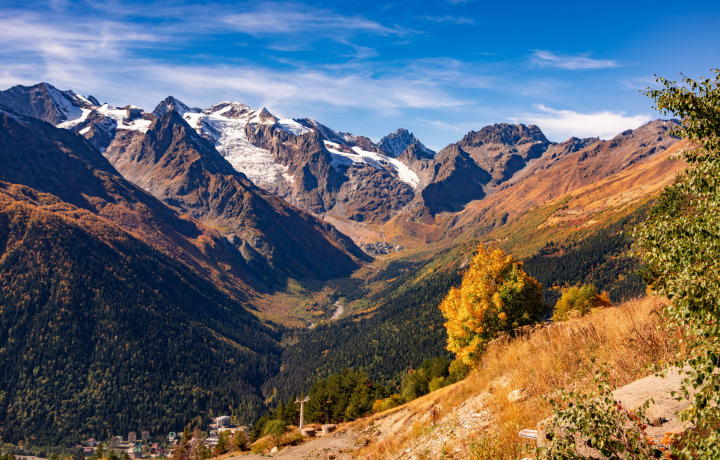 Домбай — известный горнолыжный курорт, расположенный в западной части Главного кавказского хребта. Это открытый музей природы, с уникальной флорой и фауной. Вас навсегда покорит великолепная круговая панорама со множеством вершин и ледников, сияющих при ярком солнце на фоне пихтовых лесов.