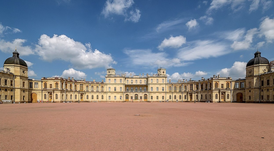 В 1765 году Екатерина II пожаловала Гатчинскую мызу своему фавориту Г. Орлову. Будучи заядлым охотником, граф Орлов построил здесь охотничий замок в классическом стиле. Трёхэтажный центральный корпус украшен башнями, а симметричные дугообразные переходы соединяют его со служебными флигелями — Кухонным и Арсенальным каре. Снаружи замок отделан пудостским известняком — местным камнем, декоративные достоинства которого высоко оценил автор проекта, итальянский зодчий А. Ринальди. В 1783 году Екатерина II выкупила замок у наследников фаворита и пожаловала сыну — Павлу Петровичу. В ожидании своего восшествия на престол цесаревич провел в нём 13 лет и превратил охотничий дом в императорский дворец.