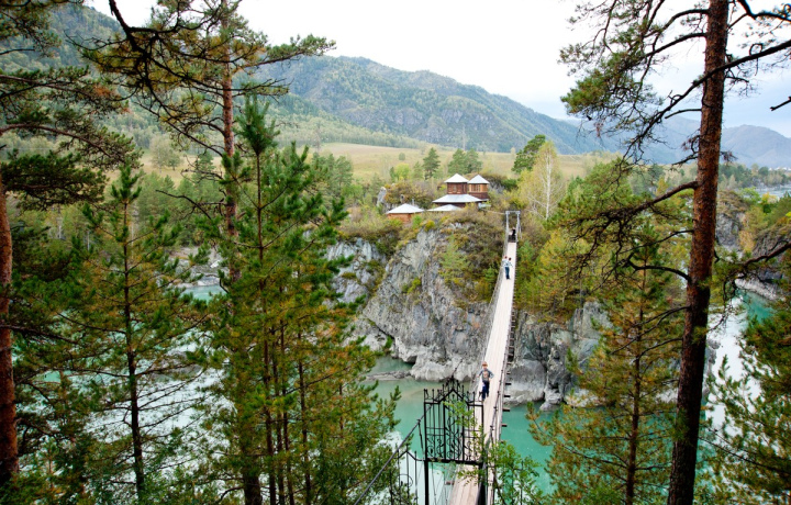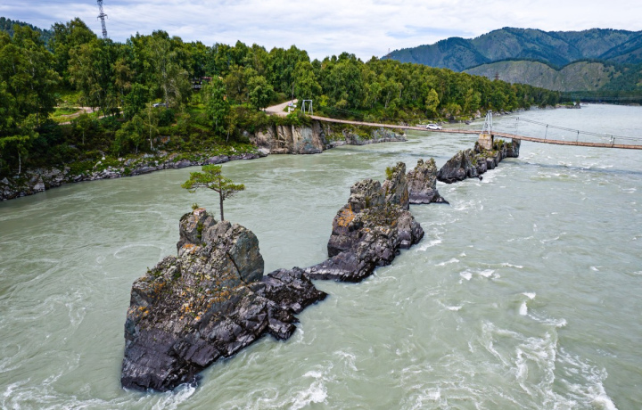 Ороктойский мост. Понаблюдаем, как лавообразные скалы тонут под мощными потоками горной реки Катунь. И насладимся эффектными видами на Чемальскую долину.