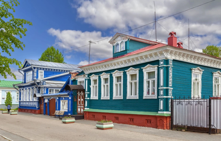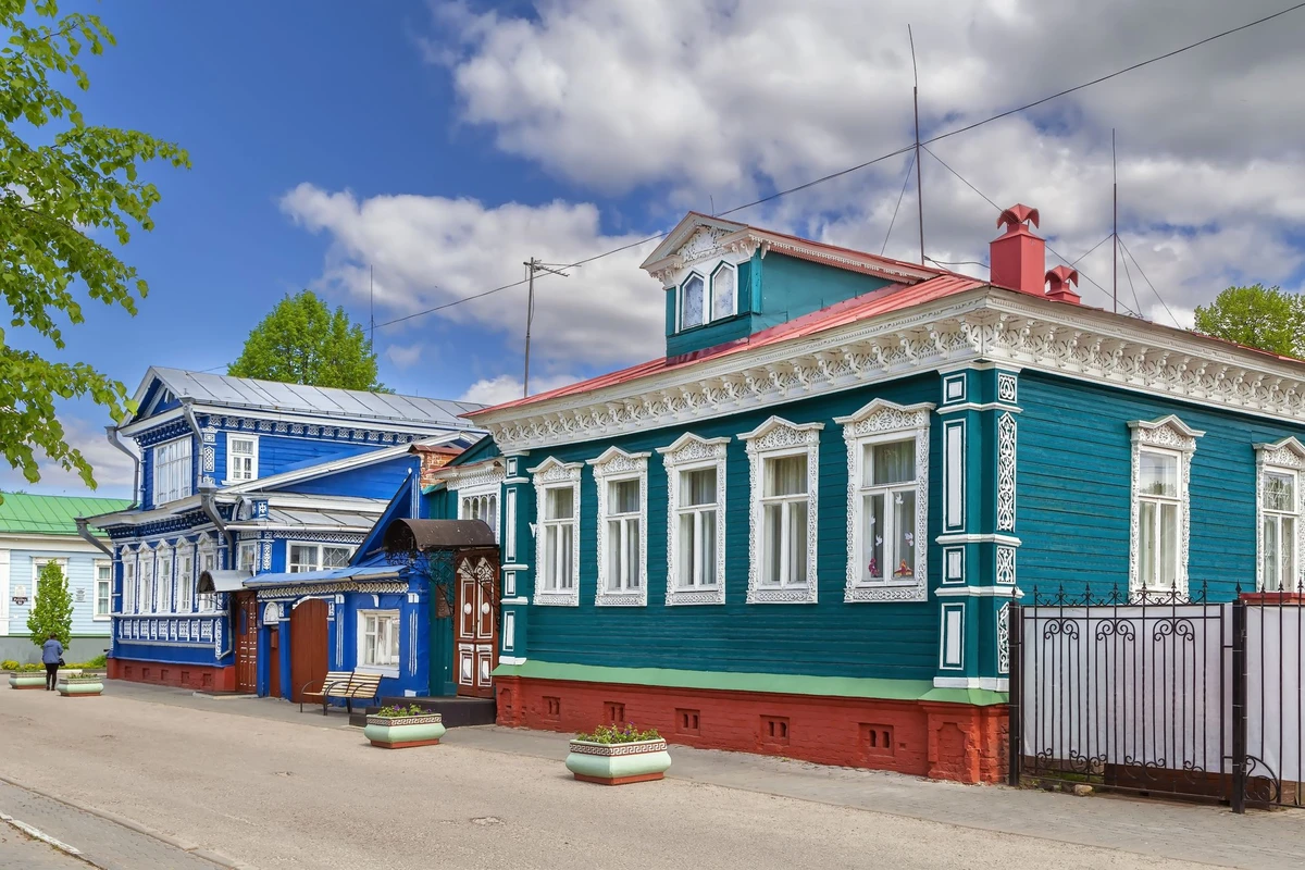 Вы погуляете по центральным улицам Городца с купеческими домиками и деревянными избами с нарядной резьбой.