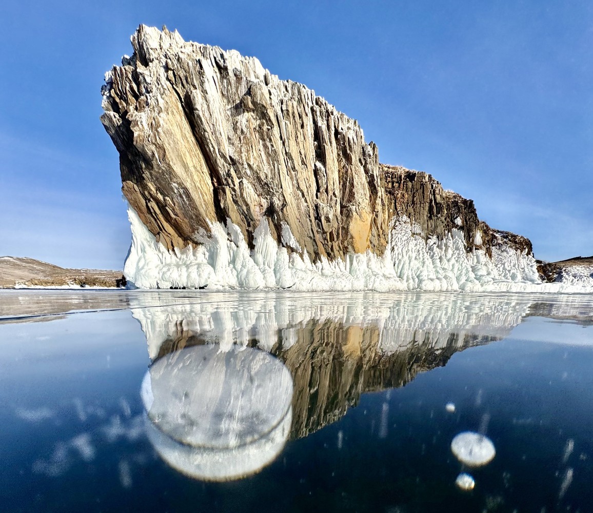 Живописное побережье большого Байкала, где воды или лёд встречаются со скалами.