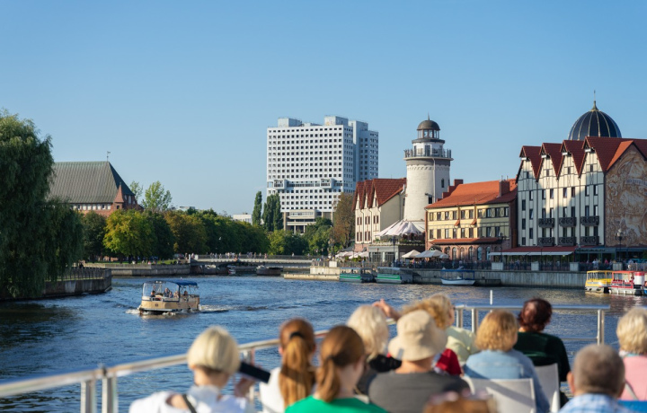 Вечерняя водная прогулка по реке Преголя с аудиогидом (40 мин) — живописные виды на Рыбную деревню, остров Канта, мосты и городские огни.