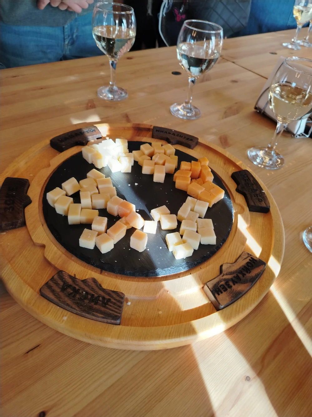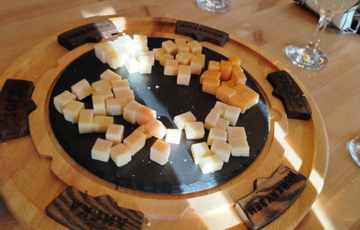 Сыры, марципан, шоколад и вино в уютной сыроварне открытого типа.