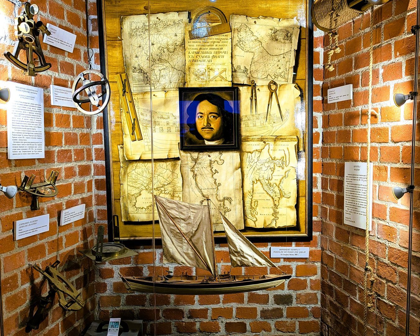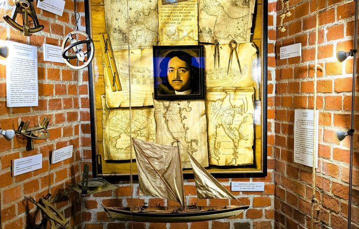 Начинается маршрут с экспозиции моделей знаменитых кораблей. Здесь раскрывается история становления русского флота — от первых петровских экспериментов до сражений Северной войны. Вы увидите модели ботика Петра I и бота «Фортуна» — памятников судостроения петровской эпохи, дошедших до наших дней. Познакомитесь с устройством кораблей и узнаете, как Пётр I изучал кораблестроение в Европе и лично участвовал в строительстве судов. Рассматривая мореходные инструменты, поймёте, как моряки ориентировались в море до появления привычных навигационных приборов, и почему носовая фигура корабля называлась гальюнной.