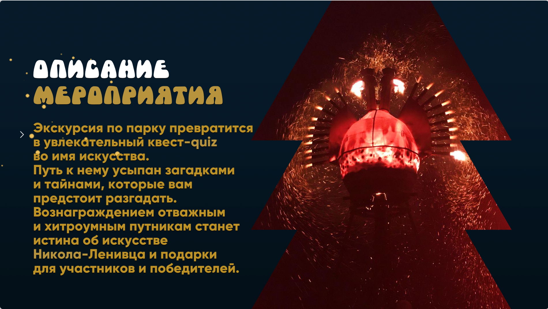 Во время квеста вы обнаружите среди лесов и полей масштабные инсталляции — деревянные скульптуры, гигантское ухо, лабинтинты и другие объекты, созданные известными художниками и архитекторами. Каждый арт-объект имеет свою историю создания и символическое значение.