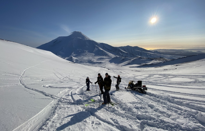 Мы встретим вас в Петропавловске и отправимся к вулкану на снегоходе и прицепленным к ним нартам. После вы пересядете к нам на снегоход — и по одному человеку мы буквально за 2-3 минуты забросим вас на высоту.