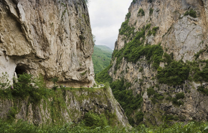 15:00 — Черекская теснина. По серпантину доедем до этого сурового ущелья, 1000-метровые скалы которого буквально нависают над дорогой. 20-30 мин. на прогулку и фото.