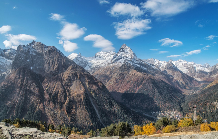 Курортный поселок Домбай покорит вас захватывающими дух видами на величественные горы с заснеженными вершинами и ледники, свисающие с мощных глыб массива Джугутурлючат. Кроме того, вы увидите ущелья Алибек, Домбай-Ульген и Аманауз, словно змейки разбегающиеся у самого подножия гор. Подниметесь по канатной дороге на пик Мусса-Ачитара, отдохнете за чашечкой горного глитвейна и рассмотрите с высоты 3200 метров Кавказский хребет и реку Птыш.