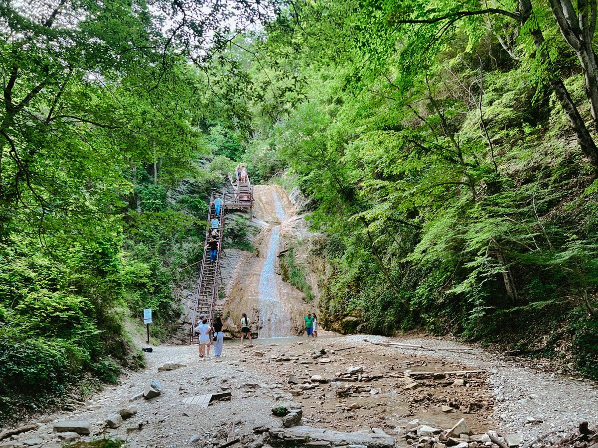 Тропа длиной около 5 км хорошо оборудована — идти легко и приятно. В пути вас ждут деревянные мостики, тень листвы и знаменитое дерево с расщелиной: традиция гласит, что если пройти сквозь него и загадать желание, оно обязательно исполнится. Говорят, именно сюда не раз приезжал Владимир Высоцкий — вдохновляться шумом воды и свободой гор.