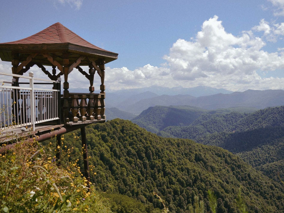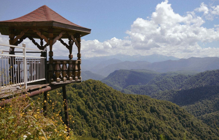 Остановимся на смотровой площадке на высоте 1320 метров на краю хребта Азиш-Тау. Изящная беседка напоминает китайский фонарик, зависший над бездной. Отсюда полюбуемся панорамами Лаго-Наки, Главного Кавказского хребта и вершин Кавказского заповедника.
