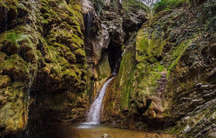 Гебиусские водопады. Они расположены на границе Туапсинского и Геленджикского районов Краснодарского края и растянулось на километр вдоль русла реки Тешебс. Всего их насчитывается 7, из которых наиболее большие и популярные — «Шнурок», «Грот», «Пасть дьявола». Маршрут, ведущий к знаменитым водопадам под силу туристам в любой физической форме: он оборудован крепкими поручнями, мостками и лестницами. Прогулка проходит по красивому лесу, по протоптанной тропе, с небольшим набором высоты. В местах, где тропа пересекает реку, есть пешеходные мостики, аж целых пять! Первый водопад — " Шнурок" — высотой 17метров. Он имеет узкий, скрученный водосток, за что и получил своё название. Вода переливается на солнце золотыми и серебряными брызгами.