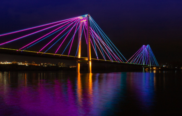 С площади Мира и Театральной площади можно любоваться подсветкой мостов и посмотреть световое шоу, в режиме которого работает подсветка в выходные и праздничные дни.
