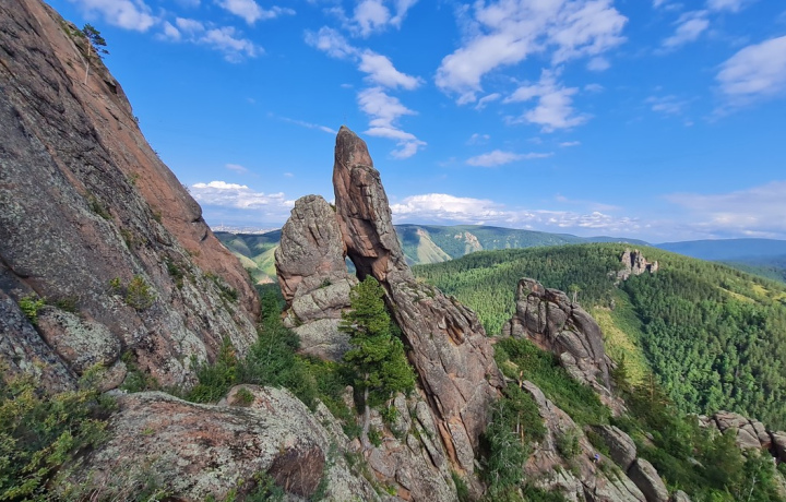 Столбы опутаны множеством тропинок, и я проведу вас по самой живописной из них. Перед вами предстанут легендарные локации национального парка: Голубая арка, Ермак, Китайская стенка, Воробушки, Малый беркут и самая большая скала заповедника (540 метров) — Такмак. Мы сможем пролезть сквозь игольное ушко грота Большого беркута, вобрав в себя древнюю силу Такмака. А после мы спустимся вдоль скального массива к старому сиенитовому карьеру на восточном входе заповедника, по пути созерцая скалы Великий Могол, Позвонок и Тотем.
