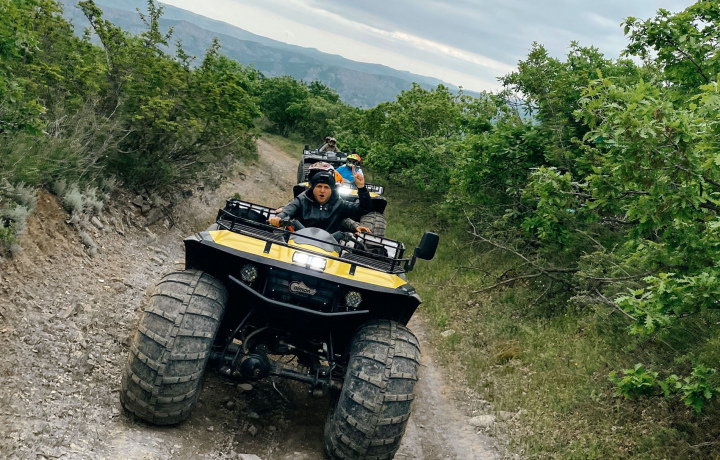 - Вся программа может занять от 5 до 8 часов: это зависит от вашей подготовки и количества квадроциклов на маршруте. Как правило, чем больше группа, тем дольше время в пути.