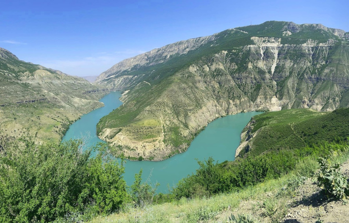 Чиркейское водохранилище. В завершении заедем еще на одну смотровую: отсюда открывается впечатляющий вид на самую высокую арочную плотину России. Чиркейская ГЭС с 200-метровой аркой, зажатой в ущелье реки Сулак, поражает мощью и размахом совместной работы природы и человека.
