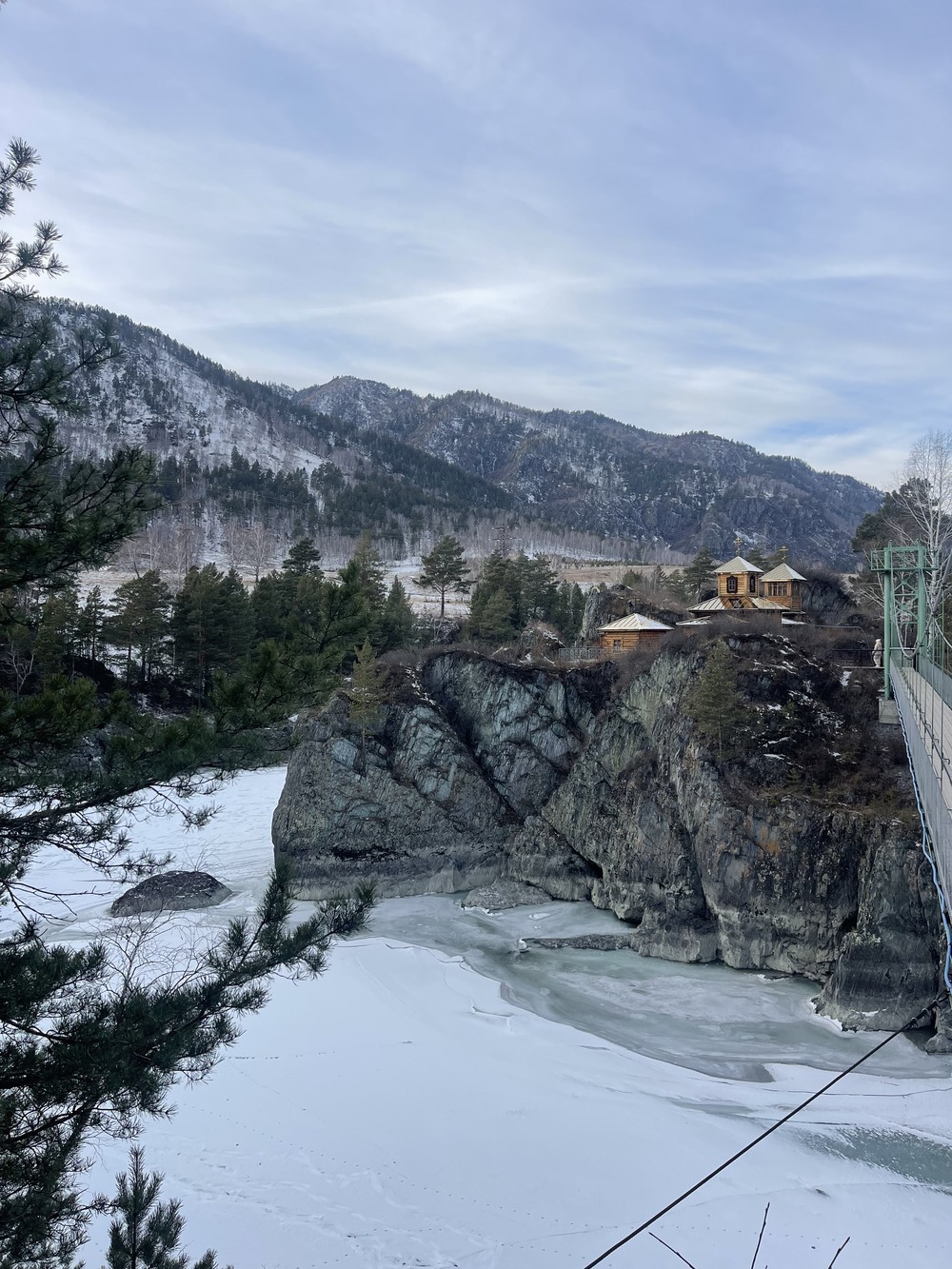 Село Чемал. Пройдём по навесному мостику над ущельем к скальному острову Патмос — на нём расположен действующий храм.