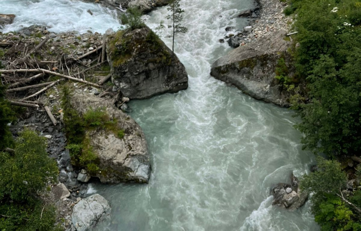 • Впереди у нас река Уллу-Муруджу — одна из самых чистых в Европе! Кроме того, её ледниковая вода ещё и полезная, так как богата серебром.