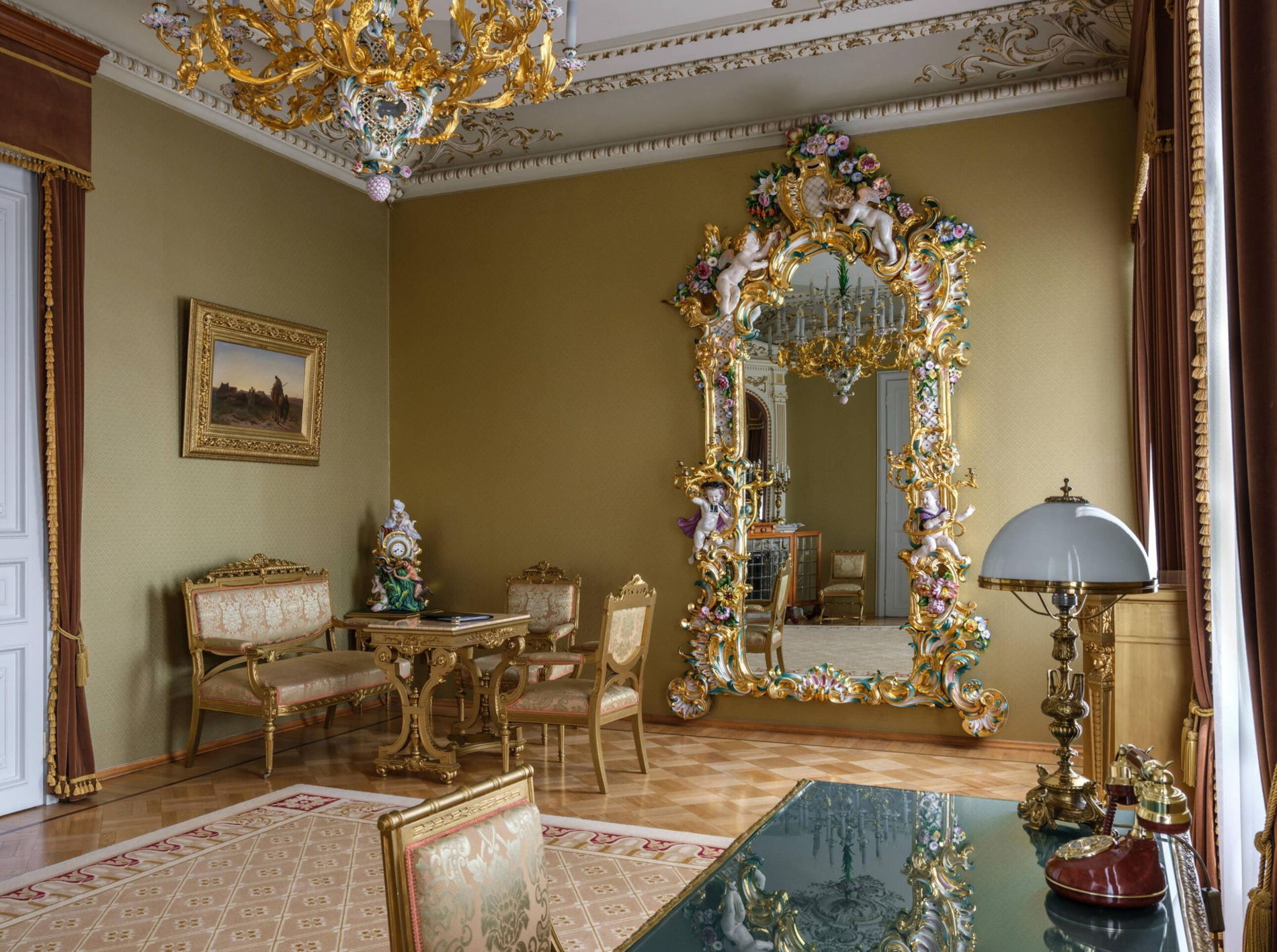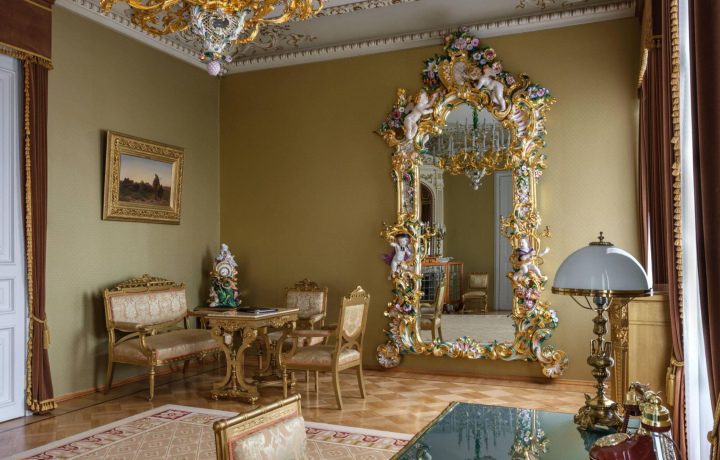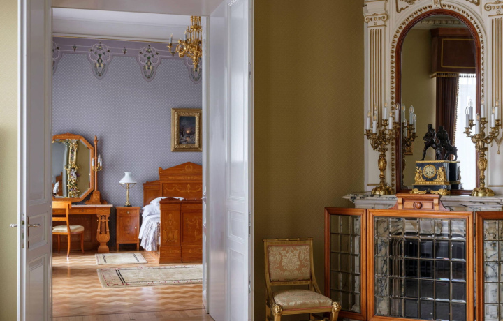 Пройдем по парящим в воздухе ажурным мраморным ступенькам без косоуров. Увидим старинные камины, бронзовые канделябры, майоликовые зеркала, золочёные лампы, инкрустированные слоновой костью столы, рояль Rud Ibach Sohn — каждый предмет является произведением искусства и помнит прикосновения Анны Павловой, Майи Плисецкой и Римского-Корсакова, Ленина и Крупской, Зинаиды Гиппиус и Дмитрия Мережковского.
