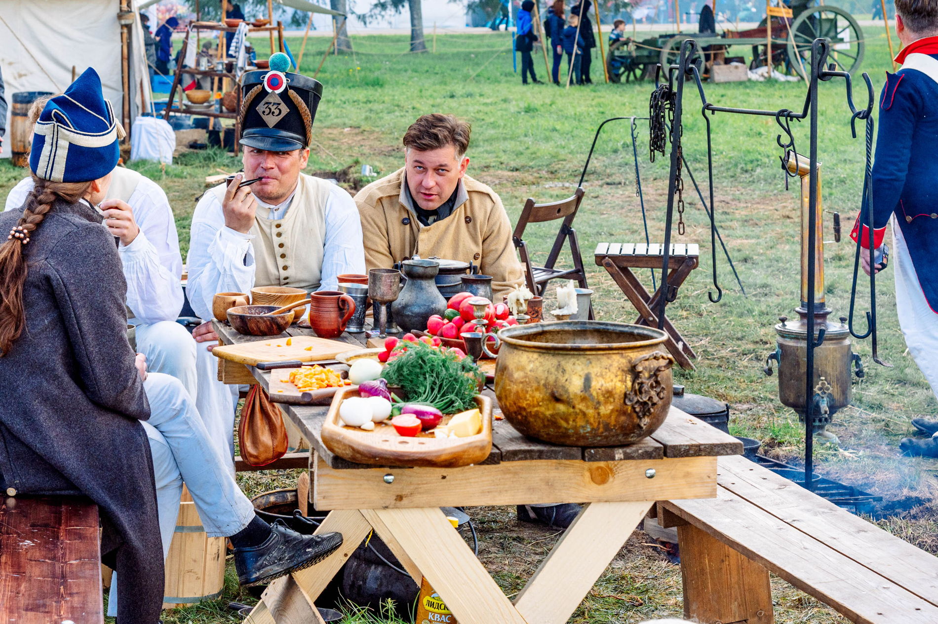 На многочисленных интерактивных площадках вы сможете понаблюдать за работой кузнеца, шорника или цирюльника и принять участие в мастер-классах, посетить полевой лазарет, побывать на плацу и попробовать себя в строевой подготовке, узнать, как кавалеристы ухаживали за лошадьми, как действовали артиллерийские расчеты, как плели фашины и изготавливали простейшие полевые укрепления, окунуться в полевые будни простых солдат, отведать блюда исторической военно-полевой кухни* (питание, услуги — доп. плата).