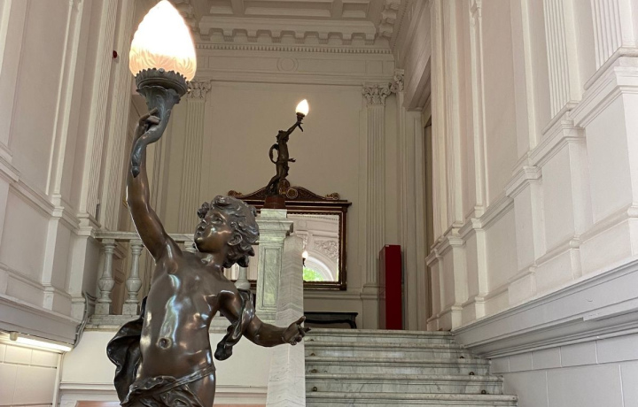Внутреннее пространство раскрывается через анфилады залов с каминами, лепниной и антикварной отделкой. Вы увидите Большой и Малахитовый залы, декоративные элементы, мрамор, керамику и детали, которые формируют цельный художественный образ интерьеров.