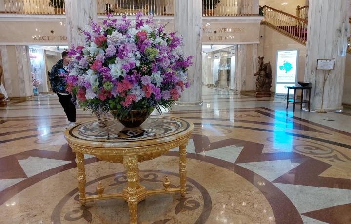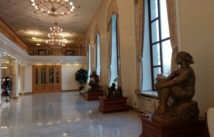 Мы полюбуемся живописным плафоном «Праздник труда и урожая на хлебосольной Украине» и многочисленными советскими скульптурами. А еще я покажу диораму Кремля и центра Москвы в масштабе 1:75, выставленную в холле гостиницы. Раскрою, когда и для чего она была изготовлена, как ее отправляли на национальную выставку в Нью-Йорке и с трудом возвращали домой.