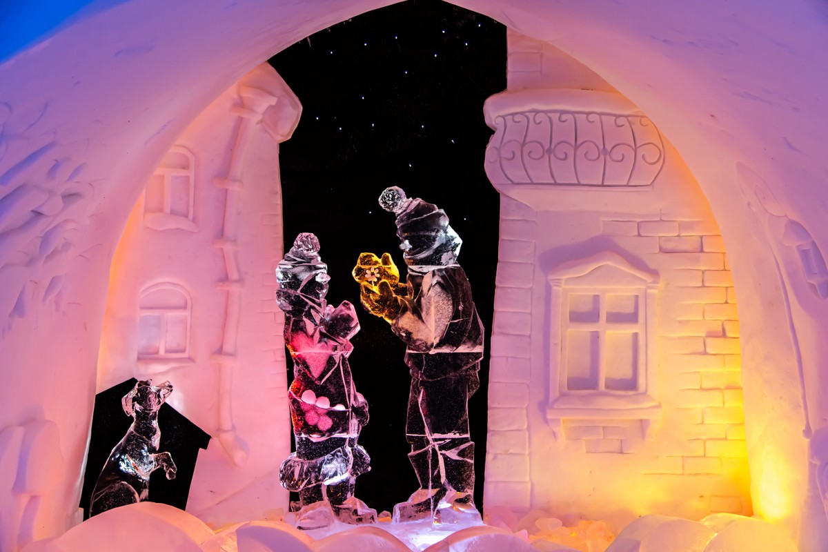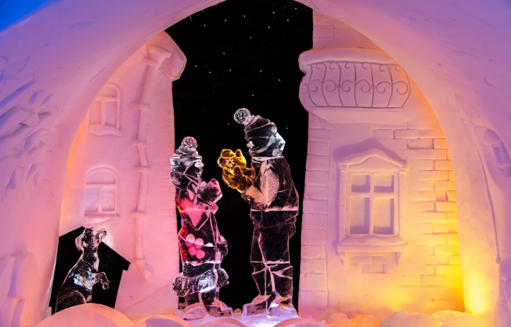 14:00–14:30 — Снежная деревня. Вы посетите уникальное арт-пространство, созданное полностью из снега и льда. Каждый год это новый проект с авторскими залами, ледовыми экспозициями и фантазийными узорами.