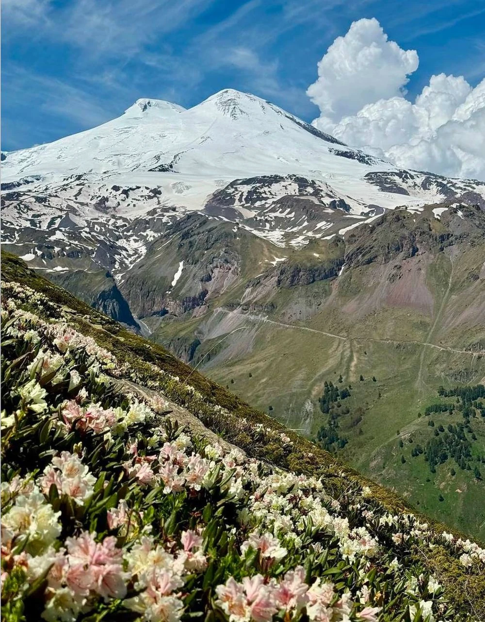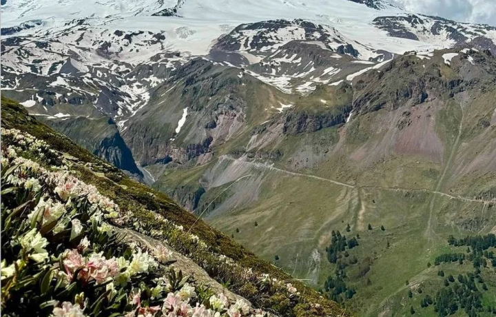 Подножие Эльбруса с панорамными видами на обе вершины. Возможен подъём на канатной дороге — за доплату. Коротко расскажем об особенностях вулкана и альпинистских маршрутах.