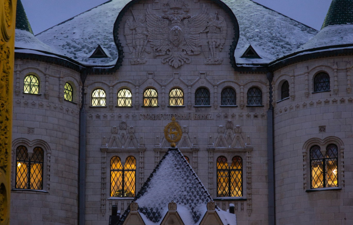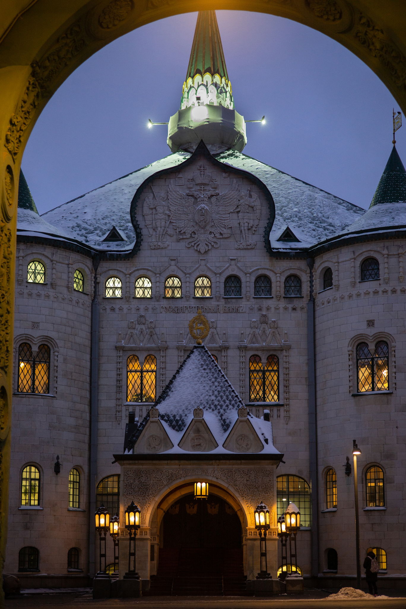 - великолепный терем Государственного Банка, который открывал сам Николай II и на фасаде которого чудесным образом сохранились и двуглавый орел и герб СССР;
