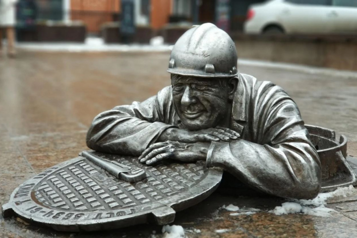 Металлическая скульптура добродушного сантехника, вылезающего из канализационного люка, установлена в 1998 году. Идею создания такого памятника подал мэр города В. Рощупкин, впечатлённый аналогичным арт-объектом во время поездки в Словакию. Скульптура создана архитекторами С. Норышевым и В. Вахитовым. Открытие состоялось во время празднования Дня города.