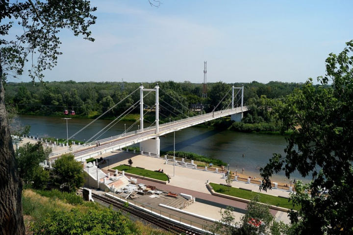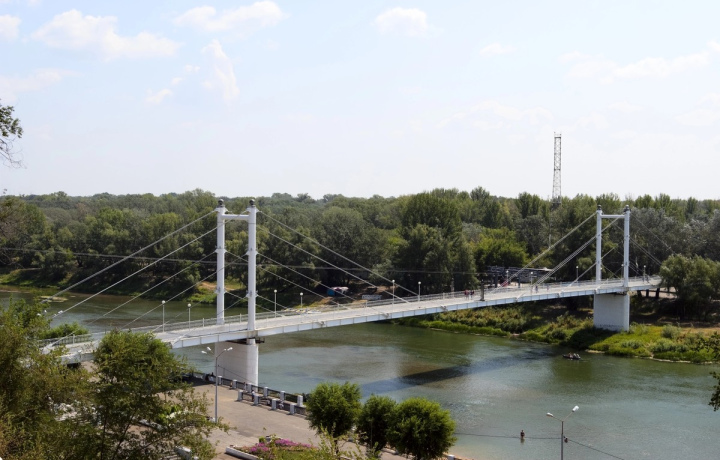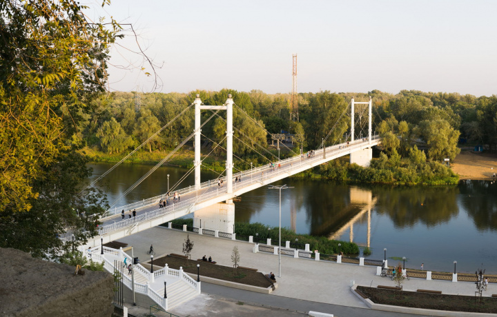 Первый наплавной пешеходный мост, соединивший европейский и азиатский берег Урала, возвели в 1835 году. Деревянное полотно сооружения приходилось каждый год перекладывать заново. Новую подвесную переправу построили в 1982 году. В наши дни пешеходный мост «Европа-Азия» стал одним из символов Оренбурга. На европейском берегу к нему от смотровой площадки и памятника Чкалову спускается каскадная лестница.