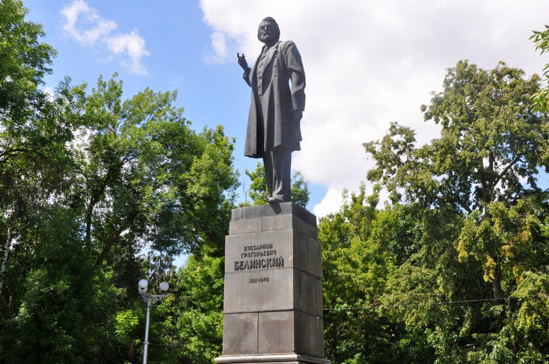 Памятник В. Г. Белинскому установлен в сквере за областным драматическим театром Пензы в 1948 году. Это уже второй памятник Белинскому на этом месте. Первый был взорван в 1918 году во время восстания Чехословацкого корпуса. Детские и юношеские годы Виссариона Григорьевича прошли в Пензе. Его именем названы улицы и скверы города. Великий литературный критик и публицист стоит в полный рост на высоком постаменте. Высота скульптуры — 5,5 метра. Четырёхгранный 5-метровый постамент облицован серым мрамором. Памятник спроектировал Леонид Поляков в соавторстве со знаменитым скульптором Е. В. Вучетичем.